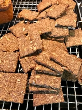 When the mixture is of dough consistency put onto prepared tray. Add another piece of parchment paper and the top and roll out to a thin even layer on the tray. Approx 5mm thick.